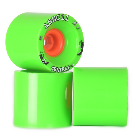 The 83mm Centrax HD (AKA the "MoMo") is a super wide centerset and symmetrical wheel designed for superior traction. 83mm Centrax are the WIDEST wheels made by ABEC 11 and have a ginormous 77mm contact patch. The urethane depth is amazing which means these are massive steam-rollers wheels. Centerset wheels can be flipped to better balance wear over time. The HD Core is taller and wider than the core in the standard Centrax and therefore reduces any chatter that could come from wheels with unsupported/flexible lips. The tiny radius and chamfer on its edges maintains a huge contact patch, nearly the entire width of the wheel.