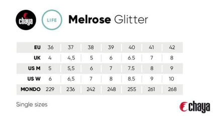 When you cruise the streets with the Melrose Glitter from CHAYA you feel the roller skate spirit and stand out. This trendy, affordable roller skate owes its WOW-effect to the glitter upper. It is a classic retro style boot. The comfortable, form-fitting shoe is made from vegan materials so you don't have to compromise. The boot is firmly mounted on the lightweight, fiberglass reinforced Aja composite plate. The CHAYA Melrose Glitter is ready to go right out of the box and comes with durable Octo Spectrum Outdoor wheels and smooth-running WICKED ABEC 7 bearings. Whether you're buying your first pair of skates or expanding your collection, the CHAYA Melrose Glitter roller skate will delight you with its look and feel.