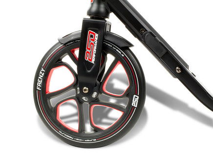 The new Frenzy Recreation is our new 250mm front wheel scooter offering increased power to push ratio with its big wheel set-up. In addition to the large front wheel it uses a 215mm rear wheel allowing riders to go further for longer. The Frenzy Recreation includes our new easy-to-use hand-release folding mechanism, utilizing a trolley mode as opposed to a carrying it for conveniently effortless transport when not being ridden.