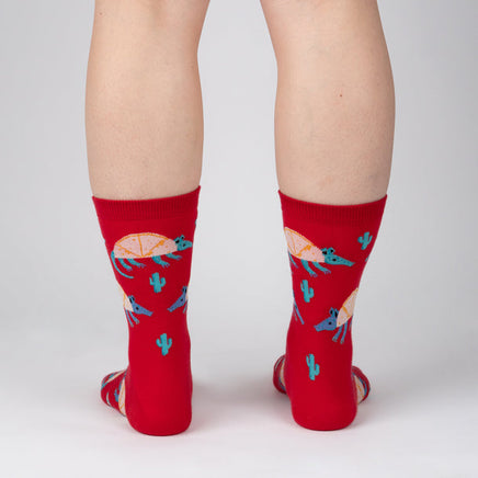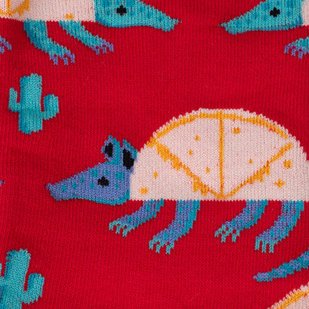 Armadillos with a dash of Tex-Mex flair! Funny socks featuring a mashup of the armadillo and their favorite snack, a melty quesadilla.
