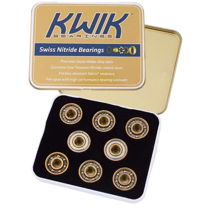 Utilising proven Swiss-Made hardened chromium steel alloy balls, the races of th Kwik Swiss Nitride bearings-the surface where friction is created with the alloy balls - are coated with an imperceptibly thin coating of Titanium Nitride to produce the fastest and longest roll available today. And you'll be able to relas and enjoy that roll right away because Kwik Swiss Nitride bearings come with XK1 Lube already applied for a bearing that is as easy to care for as it is to enjoy.