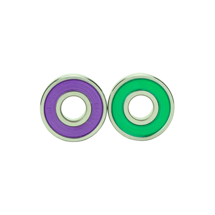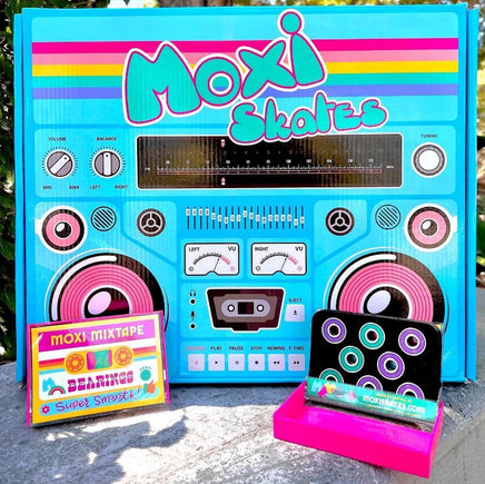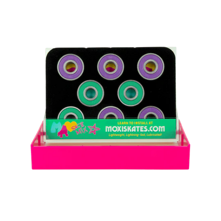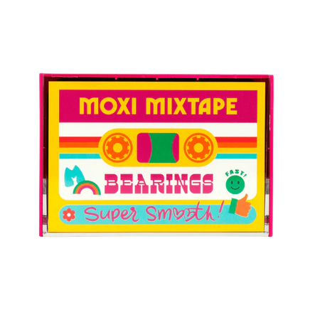 Moxi Mixtape Bearings are a two-toned 16 pack of 8mm bearings made for quad roller skates and packaged into a real cassette case. Each package contains 16 purple and teal friction-resistant covers. Lightweight and durable to withstand all types of skating including ramp skating, outdoor skating, rink and even roller derby. The balls are lubricated in the thinnest high-speed oil designed for quad skaters who crave a faster, more durable, and smooth forever roll experience, requiring a fraction of the cleanings that greased ones do. Mixtape bearings are pre-spun before they are packaged so they require no break-in session.