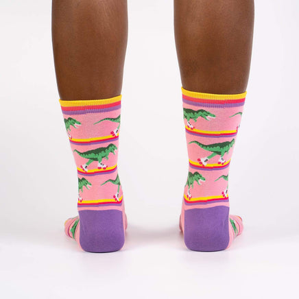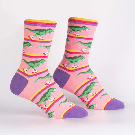 What does T-Rex say when she’s angry? “RAAAAAAWR!” How does T-Rex order her steak when she goes to a fancy restaurant? “RAAAAAAAWr!” How does T-Rex’s knee feel after she scraped it? “RAAAAAAAWR!” When we asked her where she wanted to have her birthday party, guess what she said? “RAAAAAAAAAWR!” We thought she meant the rawr-ler rink, but come to think of it, maybe “RAAAAAAAAAWR!” is the only thing she knows how to say. Regardless, she looks like a natural out there, so we turned the whole scene into these Rawr-ler Rink Crew Socks.