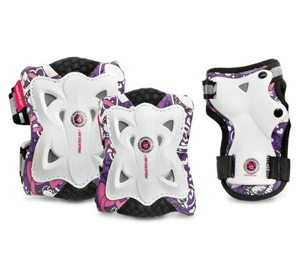 The Powerslide Kids PRO BUTTERFLY set with its cool shaped hard cap and the trendy design doesn´t just look great, it also fits and protects really well. Kids will love to wear this pre-shaped lightweight protection set during their activities. The padding construction absorbs high impacts for maximum protection and the hard-shell slides on impact. The reflective materials shine bright when spotted by light to enhance safety. Two elastic Velcro straps and a cotton sock sleeve keep the protector in place in case of a fall. The Powerslide Kids Pro set can be used for all kind of action sports like skating, skateboarding or scooter riding.