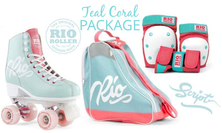 Package includes Rio Roller Script Teal Coral Skates, Rio Roller Script Teal Coral Skate Bag and Rio Roller Red Mint Pad Set.